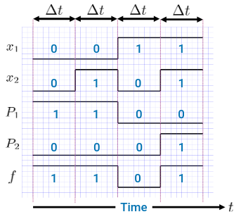 We draw the result of the output, and call that a timing diagram. It shows the changes in waveform for each internal signal of the logic network, and the resulting outputs. For now, “time” is represented by , which has a value which is equivalent to changing each variable.